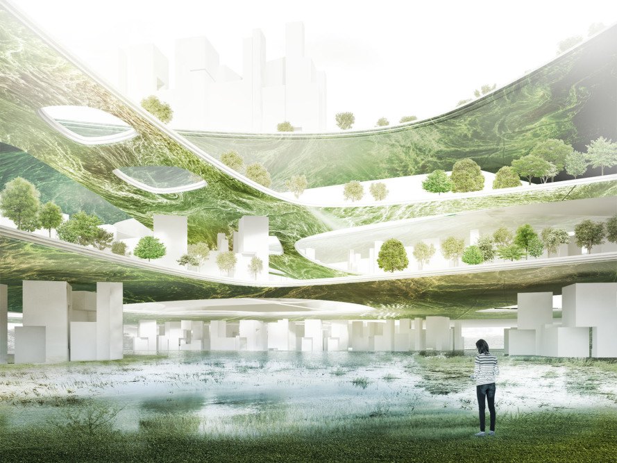 RAW-NYC for Liberland envisions a micro-nation formed by an open source society that embraces freedom and provides equal opportunities to innovate. A value synonymous with freedom, innovation safeguards the needs of future generations. The systems of Liberland’s built and natural environment are integrated to create unlimited opportunities for its citizens regardless of their ethnicity, race, age, gender or profession, allowing them to reach their full potential and participate collectively in financial gains. The urban environment is constructed in dense nodes around transport using Inverted Archeology, an urban design and architecture technique specifically formulated by the RAW-NYC for Liberland team for this project, whereby the city-state is built in consecutive temporal layers to form a self-sufficient, compact, dense, integrated and transit friendly urban fabric. It is an eco-city state with a minimal ecological footprint that cultivates and grows algae on the underside of each city layer, producing power and supporting an urban farming strategy that does not require sunlight. Simply put, Liberland is the first algae-fueled nation-state.